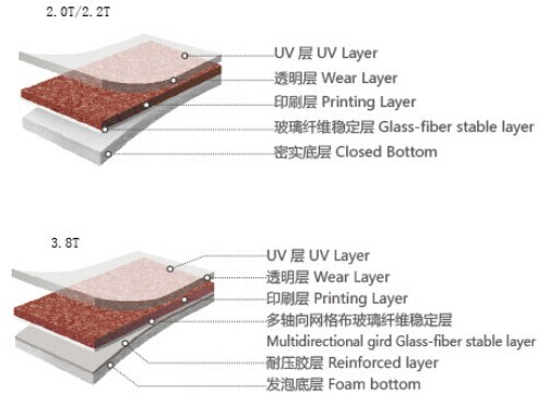 产品厚度:2.0/2.2/3.8mm 耐磨层厚度:0.5/0.7/0.7mm 卷长:20m卷宽:2m 产品原料:聚氯乙烯100%新料 防火性能: