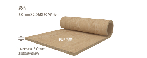 产品厚度:2.0mm 耐磨层厚度: 卷长:20m卷宽:2m 产品原料:聚氯乙烯100%新料 防火性能:B1(B-s1,to )级